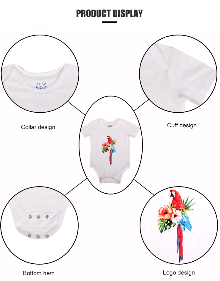 Printing baby outfits for summer wear, standard baby outfits, from 0 months to 36 months can wear. Soft and comfortable high quality combed cotton material, active and eco-friendly printing, custom your own brand baby onesuit with your brand logo and label.