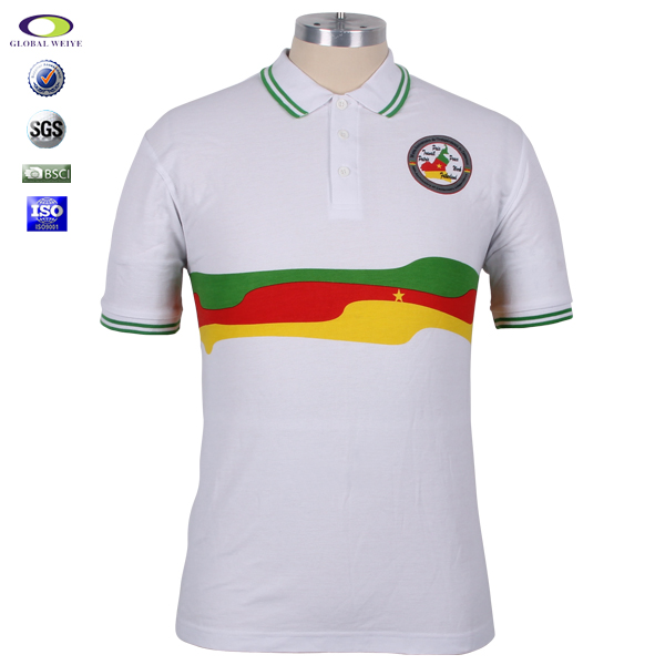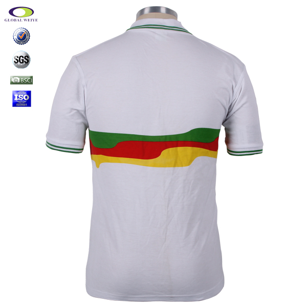 男士短袖白色印花Polo衫,领子及袖口下摆印绿色双线条纹,胸前徽章印花,前幅高品质环保丝网印logo 经典短袖时尚翻领款式 让POLO衫更独特。