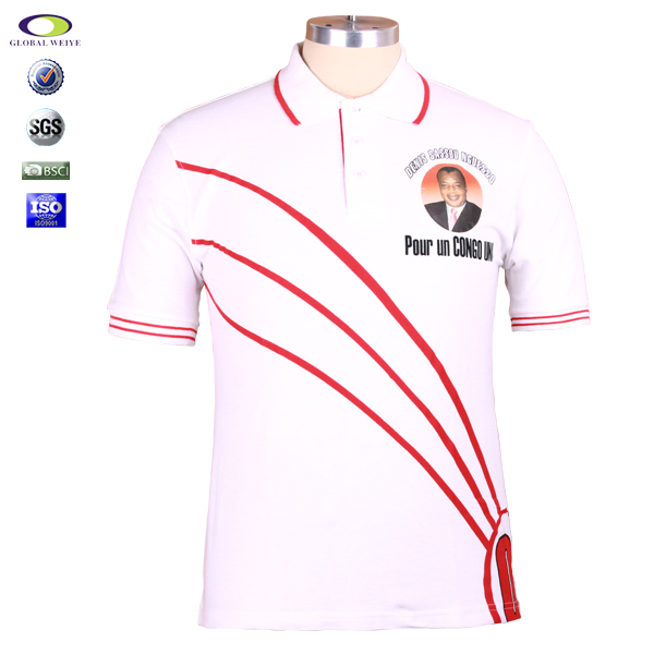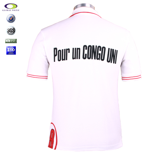 男士短袖白色印花Polo衫,领子及袖口下摆印红色双线条纹,胸前徽章印花,前幅高品质环保丝网印logo 经典短袖时尚翻领款式 让POLO衫更独特。