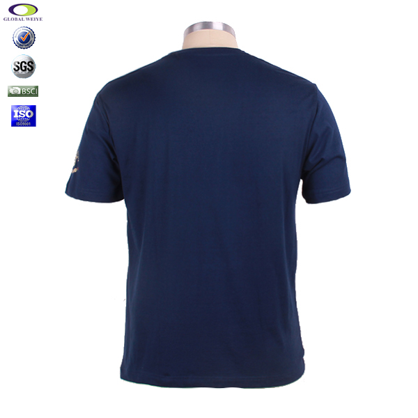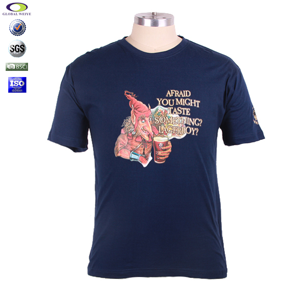 广告宣传深蓝色男士圆领烫画T恤衫,前幅及袖口高质量烫画图案,高性价普通棉纱   吸湿透气  不起球、吸湿保暖、天然亲肤、环保染色 经典短袖时尚圆领款式 。