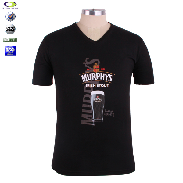 黑色印花V领短袖广告宣传T恤打底衫定制,前幅高质量丝网印logo,专业纸样 标准裁剪,高性价棉拉架面料 、弹性好,耐磨,不会轻易缩水,环保染色 经典短袖时尚V领款式 。
