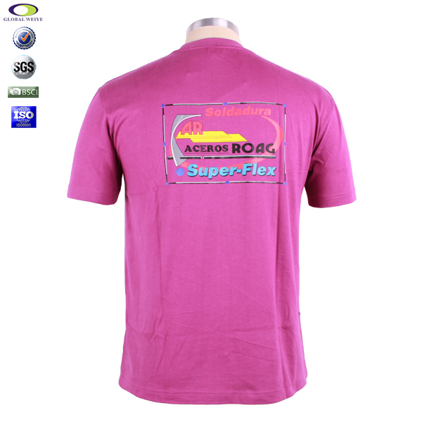 男士广告宣传衫玫红色后背印花圆领短袖T恤衫,后幅高品质环保丝网印logo,高性价比精梳棉   吸湿透气 不起球、吸湿保暖、天然亲肤、环保染色,经典短袖圆领款式,环保丝网印logo
