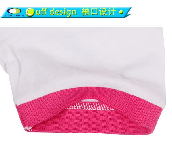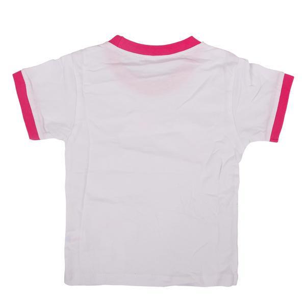 White tees clothes for kids girls, water screen silk printing on front, blue neck and cuffs, fashion logo, material can be any like 100%cotton,cotton spandex blend, polyester, bamboo, etc, also the logo can be changed with your logo.