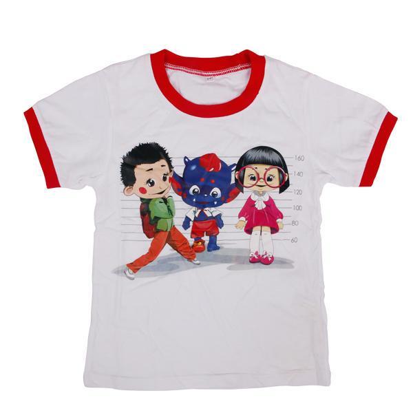 White tees for kids wear girls, transfer logo on front, red neck and cuffs, fashion style, material can be any like 100%cotton,cotton spandex blend, polyester, bamboo, etc, also the logo can be changed with your logo.
