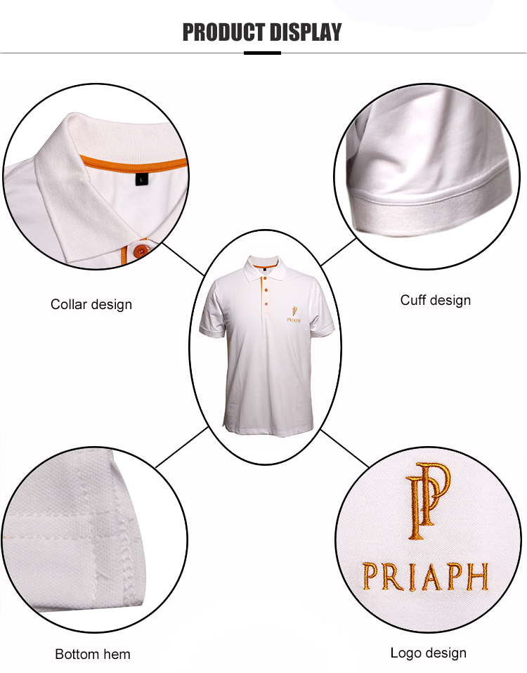 Custom logo polo shirts with pink tape on back and pink placket, white short sleeves style, mixed sizes,65%cotton35%polyester fabric.