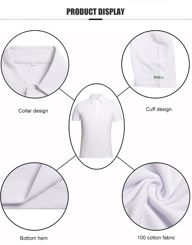 White polo shirt design, blank plain style, Flat sleeves cuffs,3 buttons, material can be customized like polyester, cotton, or mixed, etc