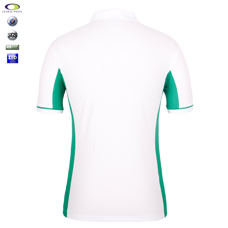 白色绿色拼接POLO衫,采用65%精棉35%涤纶布料,透气、柔软,亲肤,舒适等功能,配高品质绣章logo。