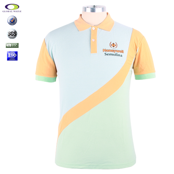 拼接POLO衫,采用精梳全棉布料,耐磨抗皱不起球、吸湿保暖、天然亲肤、蓝绿橙三色撞色拼接,款式新颖,专业纸样,修身裁剪,环保印花,特色拼接做工。