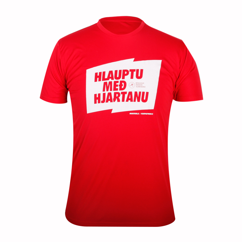 男士全涤红色马拉松运动印花圆领短袖T恤衫,采用全涤速干面料,舒适耐穿,高性价比,高品质环保丝网印logo  专业纸样 标准裁剪,经典短袖时尚圆领款式。