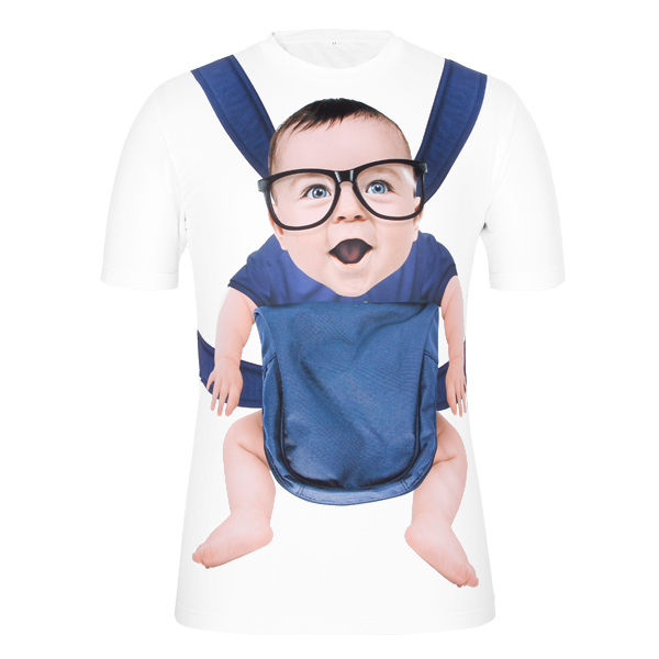 男士全涤白色胸前挂小孩印花圆领短袖T恤衫厂家定制 |