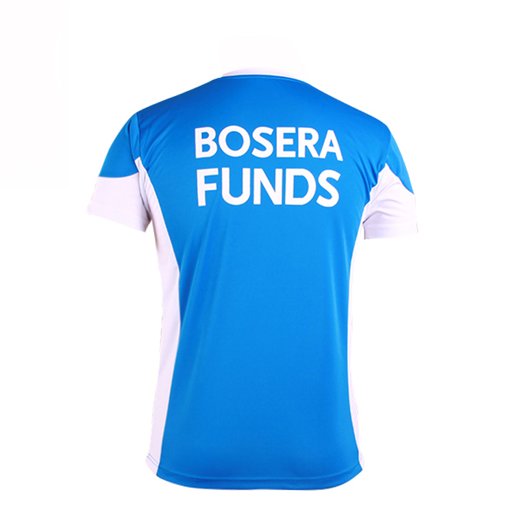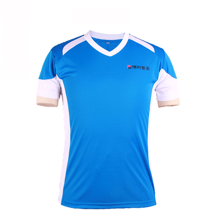 蓝色全涤V领异色领印花T恤男短袖T恤衫团服,采用全涤速干面料,舒适耐穿,高性价比撞色设计,突显时尚魅力,常适用于运动时尚休闲类场合 环保丝网印logo 专业纸样 标准裁剪,经典短袖时尚V领款式。