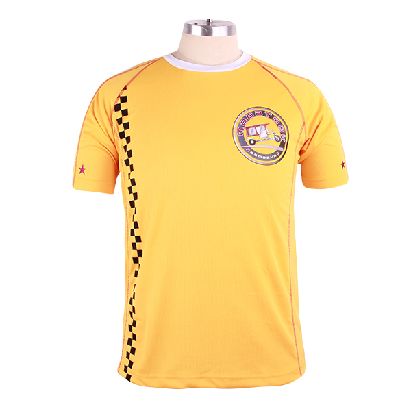 订制黄色全涤网眼异色领印花圆领刺绣T恤男短袖定制