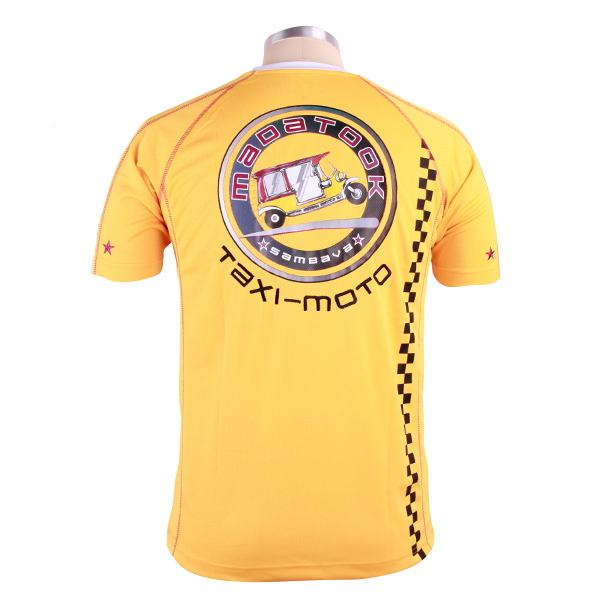 黄色全涤网眼异色领印花圆领刺绣T恤男短袖,采用全涤网眼速干面料,舒适耐穿,高性价比,高品质环保丝网印logo 精致五角星刺绣工艺  专业纸样 标准裁剪,经典短袖时尚圆领款式。