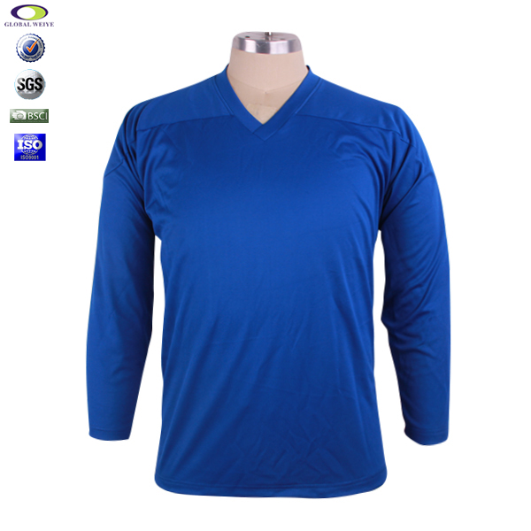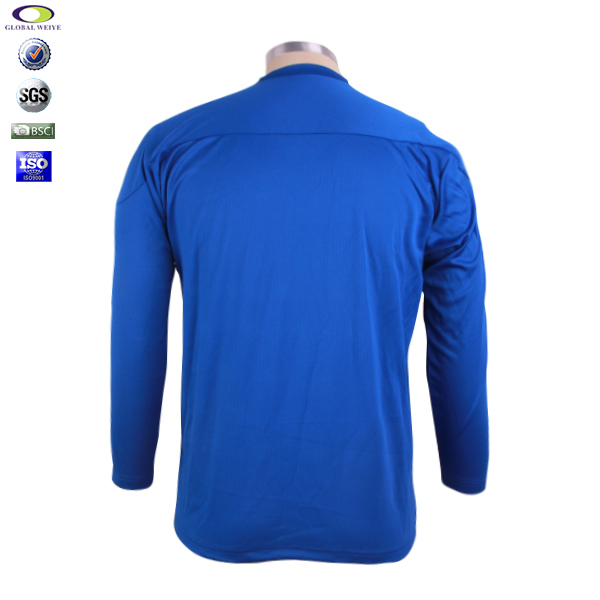 男士蓝色V领插肩空白长袖全涤网眼T恤衫定制厂家