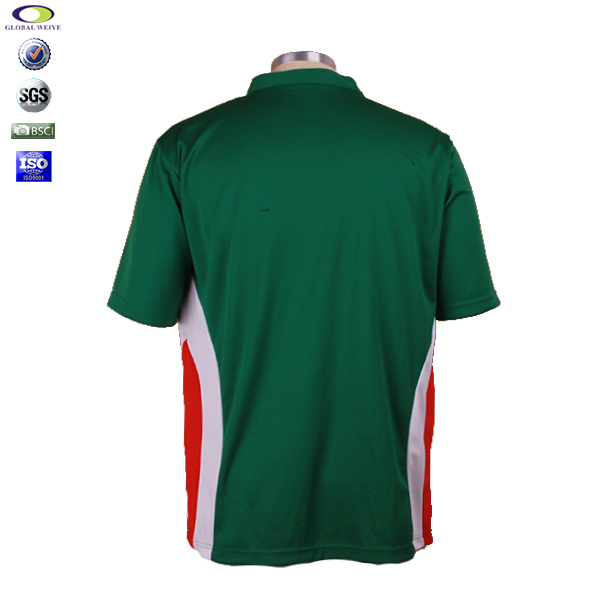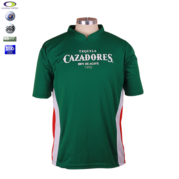 男士绿色全涤立领印花短袖T恤衫,采用全涤速干面料,舒适耐穿,高性价比,前幅高品质环保丝网印logo,立领,下摆撞色设计突显时尚魅力,常适用于运动时尚休闲类场合  专业纸样 标准裁剪.