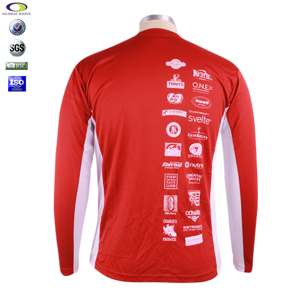 男士红色全涤圆领印花长袖运动服T恤衫,采用全涤速干面料,舒适耐穿,高性价比,前后幅高品质环保丝网印logo,红白撞色设计突显时尚魅力,常适用于运动时尚休闲类场合  专业纸样 标准裁剪.