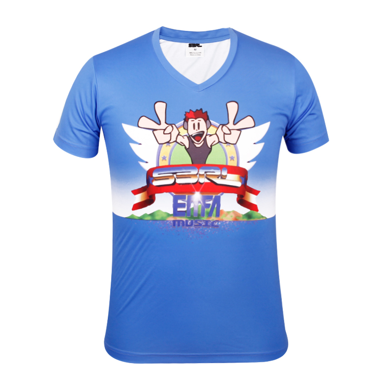 男士蓝色全涤热升华V领短袖恤衫,采用全涤速干面料,舒适耐穿,高性价比,正面热升华超清卡通图片, 专业纸样 标准裁剪.