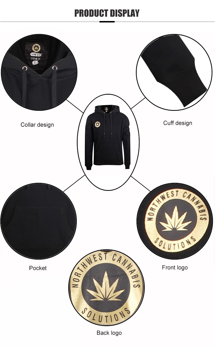 Thickened black pullover hoodie,  rib fabric cuffs and hem, blank, because 280 grams of cloth is used, logo printed on the front. In addition, there is a big pocket in front to protect your hands all the time in cold weather.