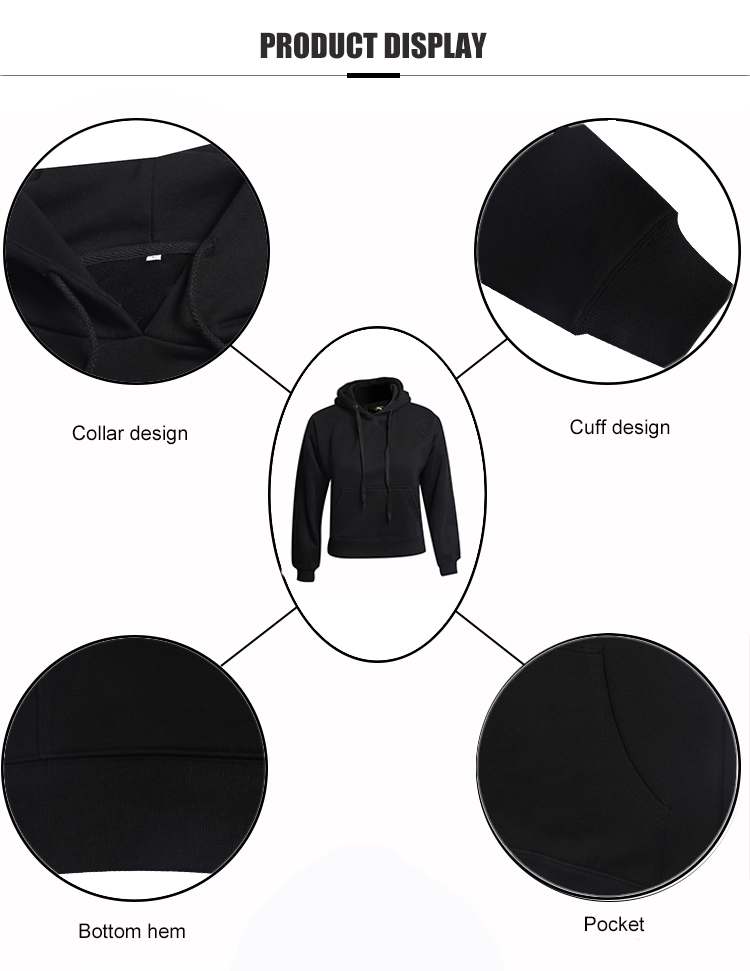 Thickened black hoodie,  rib fabric cuffs and hem, blank, because 280 grams of cloth is used, so this one can be used in autumn and winter. In addition, there is a big pocket in front to protect your hands all the time in cold weather.