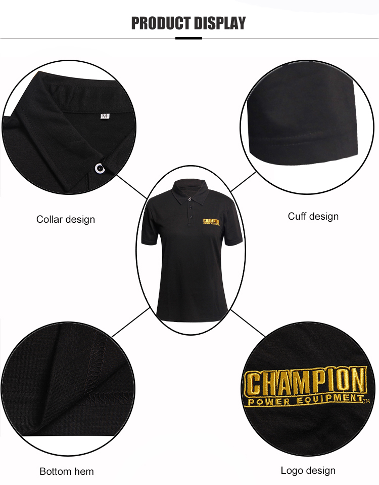 Lady’s slim fit polo shirts, waist cut design which more fit to lady’s body, 3 buttons, with yellow logo embroidery on the left chest. Custom sizes and logos as you need, silk screen printing logo also can made