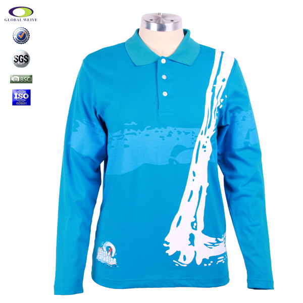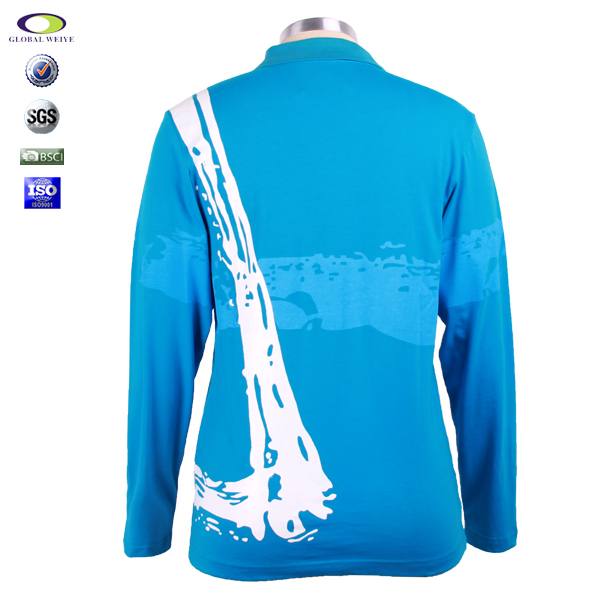 女士蓝色纯棉polo衫翻领长袖印花T恤衫定做 |