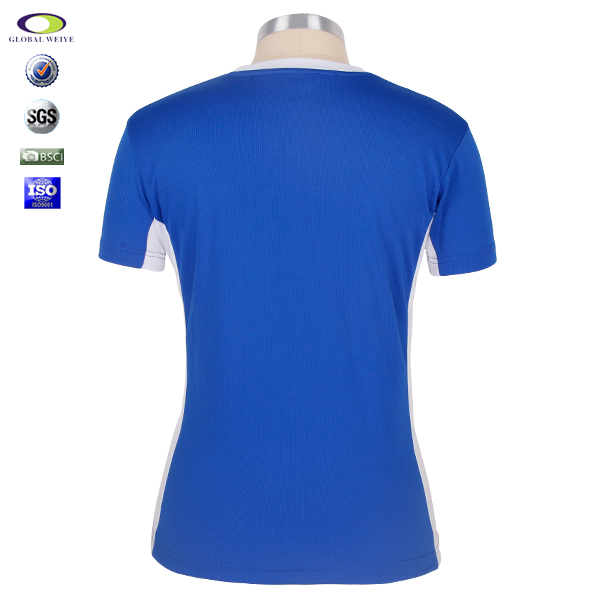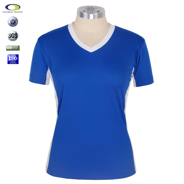 女士蓝白拼接V领短袖空白T恤衫定制 |