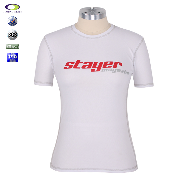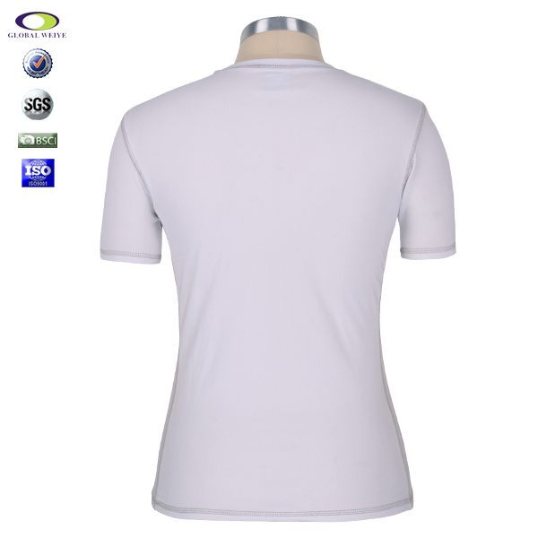 女士白色圆领短袖丝网印logoT恤衫,前幅高质量丝网印logo,专业纸样 标准裁剪,高性价网眼布  速干 坚牢耐用、抗皱免烫、不变形、热塑性强、环保染色 经典短袖时尚圆领款式 。