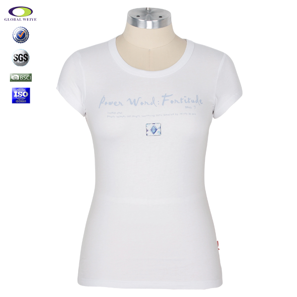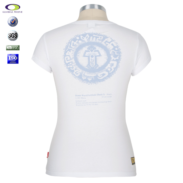 女士白色圆领短袖T恤衫,前后幅高质量丝网印logo,专业纸样 标准裁剪,高性价混纺面料 、弹性好,耐磨,不会轻易缩水,环保染色 经典短袖时尚V领款式 。