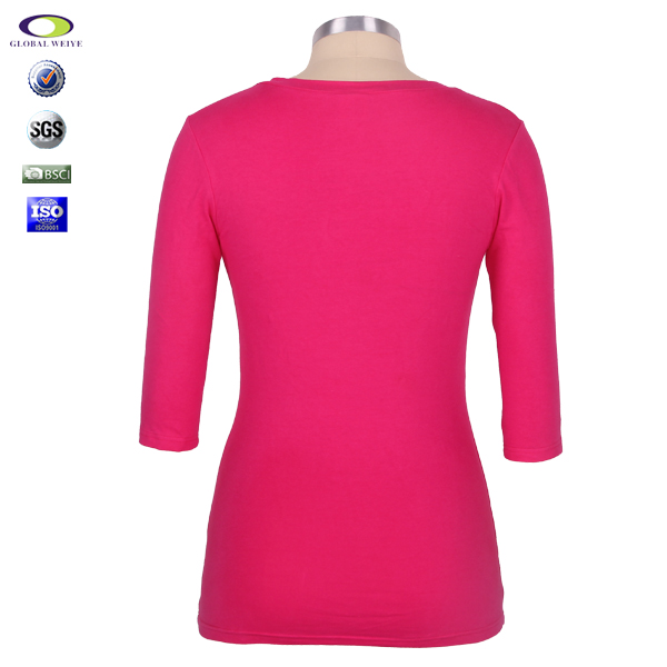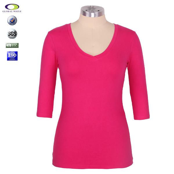 定制女士粉色V领中袖空白修身T恤衫 |
