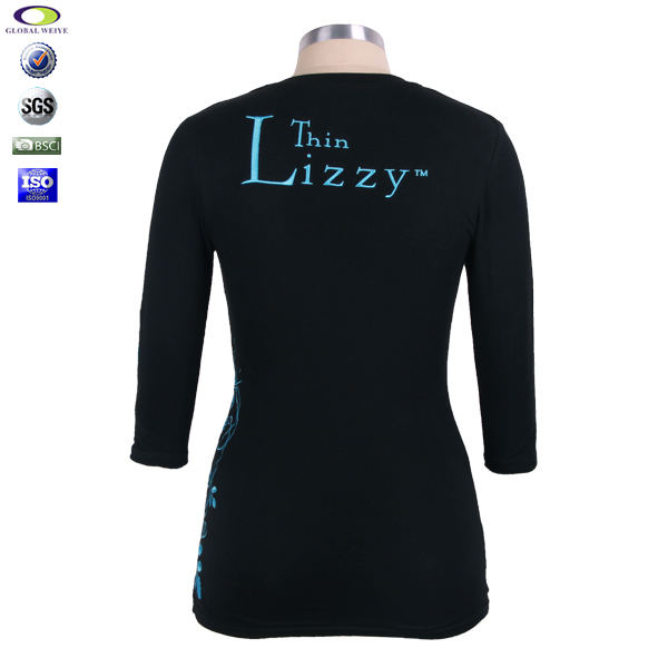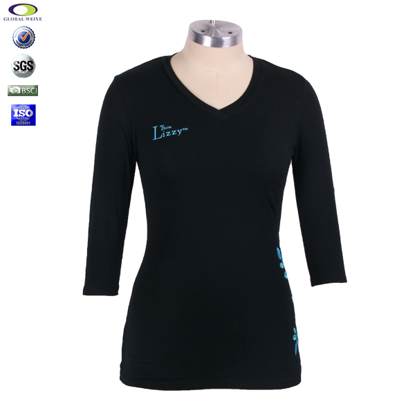 定制女士黑色V领绣花弹性长袖T恤衫 |