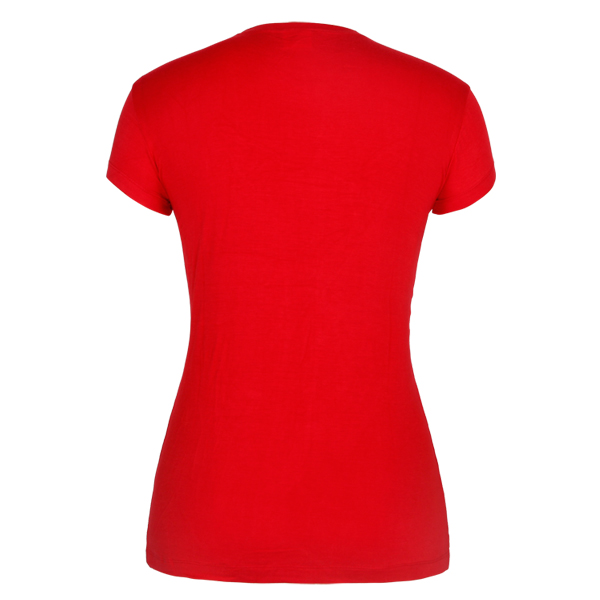 红色女士印花圆领短袖T恤衫,前幅高质量丝网印logo,专业纸样 标准裁剪,高性价棉拉架面料 、弹性好,耐磨,不会轻易缩水,环保染色 经典短袖时尚圆领款式 。